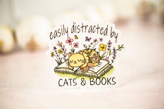 Easily Distracted By Cats & Books, Vinyl Sticker, 3x3 in.